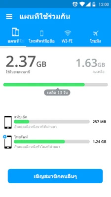 ยกระดับการจัดการข้อมูลของคุณให้เหนือกว่า "ผู้จัดการข้อมูลของฉัน" ไม่เพียงแต่ติดตามการใช้งานส่วนบุคคล แต่ยังรองรับแผนอินเทอร์เน็ตแบบใช้ร่วมกันหรือแบบครอบครัว ทำให้คุณสามารถตรวจสอบและบริหารจัดการข้อมูลของทุกคนในแพ็กเกจได้อย่างง่ายดาย อีกทั้งยังสามารถซิงค์ข้อมูลการใช้งานข้ามอุปกรณ์ต่างๆ เพื่อให้คุณมองเห็นภาพรวมที่ครบถ้วนสมบูรณ์ คุณสามารถย้อนดูประวัติการใช้งานโดยละเอียดเพื่อวิเคราะห์พฤติกรรมและปรับแผนการใช้ให้เหมาะสมที่สุด ช่วยให้คุณใช้ข้อมูลที่มีอยู่ได้อย่างคุ้มค่า ประหยัดเงินในระยะยาว และได้รับประโยชน์สูงสุดจากทุกเมกะไบต์ที่คุณจ่ายไป