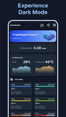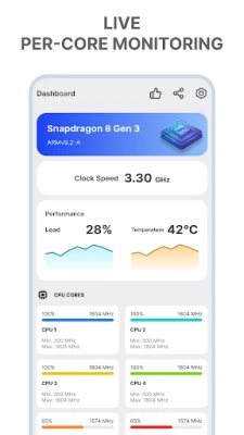 อะไรคือสิ่งที่ทำให้ "CoreSpec: Hardware & CPU Info" แตกต่าง? แอปพลิเคชันนี้ถูกออกแบบมาเพื่อมอบประสบการณ์ที่เน้นข้อมูล CPU และ GPU โดยเฉพาะ ไม่มีคุณสมบัติที่ไม่จำเป็นอย่างการติดตามแบตเตอรี่หรือเซ็นเซอร์มาให้รกตา ทำให้ได้ข้อมูลฮาร์ดแวร์ที่บริสุทธิ์สำหรับผู้ที่ชื่นชอบและนักพัฒนา ด้วยประสิทธิภาพที่เบาและรวดเร็ว ทำให้มั่นใจได้ว่าจะไม่รบกวนเมตริก CPU ที่คุณกำลังตรวจสอบอยู่ การอัปเดตข้อมูลความถี่สูงยังให้ภาพรวม "สด" ของสถานะโปรเซสเซอร์ของคุณแบบเรียลไทม์ ทำให้คุณสามารถติดตามการเปลี่ยนแปลงและประสิทธิภาพได้อย่างแม่นยำและต่อเนื่อง