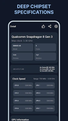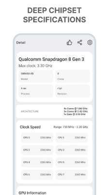ไม่เพียงแค่ CPU เท่านั้น "CoreSpec: Hardware & CPU Info" ยังให้ข้อมูลเชิงลึกเกี่ยวกับขุมพลังกราฟิกของคุณอีกด้วย ระบุผู้ผลิต GPU และตัวประมวลผลกราฟิกทันที ไม่ว่าจะเป็น Qualcomm, ARM หรือ NVIDIA พร้อมด้วยเอ็นจิ้นการเรนเดอร์เฉพาะ (เช่น Adreno หรือ Mali) ตรวจสอบเวอร์ชัน OpenGL ES ที่รองรับ ซึ่งสำคัญต่อการเล่นเกมระดับสูงและแอปพลิเคชัน 3D ที่ต้องการประสิทธิภาพกราฟิกสูง นอกจากนี้ คุณยังสามารถติดตาม Scaling Governor ซึ่งเป็นโปรไฟล์การจัดการพลังงานของ GPU ที่ควบคุมประสิทธิภาพการแสดงผลและประสิทธิผลการใช้พลังงาน เพื่อให้มั่นใจว่าคุณได้รับประโยชน์สูงสุดจากฮาร์ดแวร์กราฟิกของคุณ