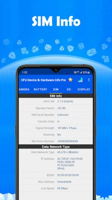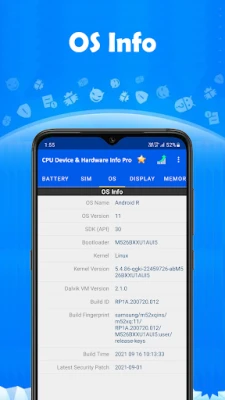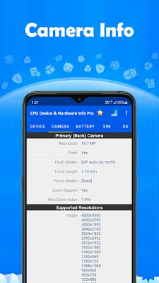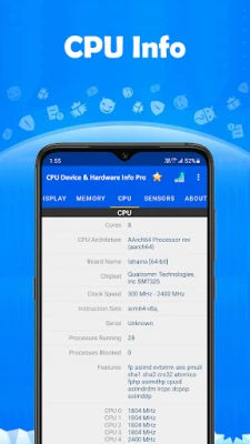 CPU Device & Hardware Info Pro นำเสนอข้อมูลที่สมบูรณ์และละเอียดเกี่ยวกับสมาร์ทโฟน Android ของคุณ เข้าถึงข้อมูลเชิงลึกเกี่ยวกับ CPU, อุปกรณ์, กล้อง, แบตเตอรี่, SIM, ระบบปฏิบัติการ, จอแสดงผล, หน่วยความจำ และเซ็นเซอร์ทั้งหมดได้อย่างง่ายดายในที่เดียว