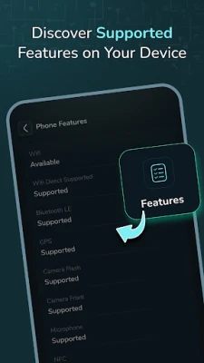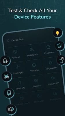 ค้นพบข้อมูลเชิงลึกที่ครอบคลุมทุกแง่มุมของอุปกรณ์ ไม่ว่าจะเป็นรายละเอียดรุ่น, ระบบปฏิบัติการ, หน่วยประมวลผลพร้อมข้อมูล RAM, รายชื่อเซ็นเซอร์ทั้งหมดที่ทำงานอยู่หรือไม่ได้ใช้งาน, ข้อมูลกล้องหน้าและหลัง, สถานะพื้นที่เก็บข้อมูล, อุณหภูมิแบตเตอรี่, รายละเอียดบลูทูธ, ความหนาแน่นและความละเอียดของหน้าจอ, รายการแอปพลิเคชันที่ติดตั้ง รวมถึงข้อมูลเครือข่ายและคุณสมบัติเฉพาะของเครื่อง นอกจากนี้ ยังมีชุดการทดสอบฮาร์ดแวร์อย่างละเอียด ไม่ว่าจะเป็นการตรวจสอบหน้าจอสัมผัส, มัลติทัช, เซ็นเซอร์วัดแสง, ไฟฉาย, การสั่น, การทำงานของเซ็นเซอร์ลายนิ้วมือ, เซ็นเซอร์ความใกล้ชิด, มาตรวัดความเร่ง, ปุ่มปรับเสียง, การเชื่อมต่อบลูทูธ และช่องเสียบหูฟัง เพื่อให้คุณมั่นใจว่าทุกฟังก์ชันยังคงทำงานได้ดีเยี่ยม